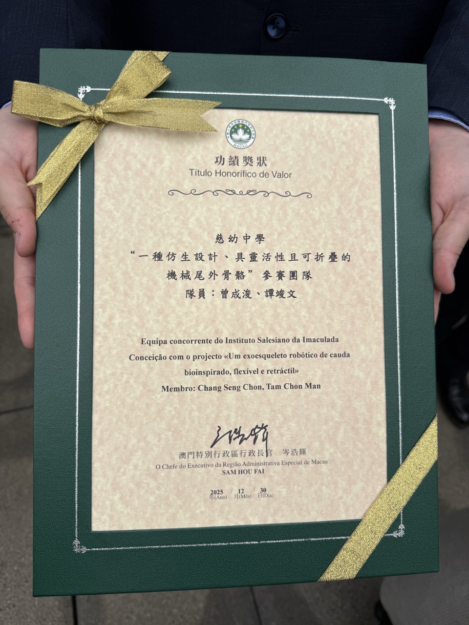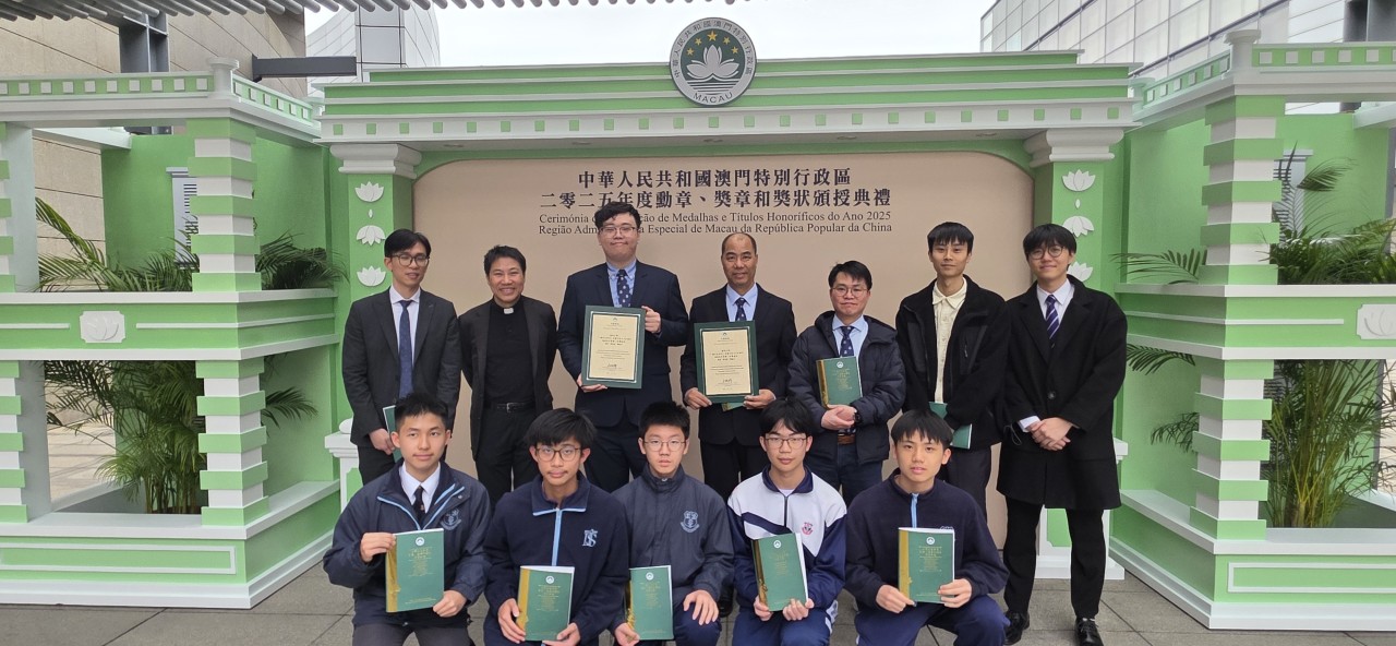 2026年1 月 30 日,澳門特別行政區政府於文化中心舉行「2025 年度勳章、獎章和獎狀頒授儀式」。 本校畢業生曾成浚與譚竣文同學憑藉作品「一種仿生設計、具靈活性且可折疊的機械尾外骨骼」,榮獲行政長官頒授「功績獎狀」。雖然兩位同學現正於外國頂尖學府深造,未能親身出席典禮,但他們的科研成果已為澳門在國際賽事中寫下輝煌一頁。