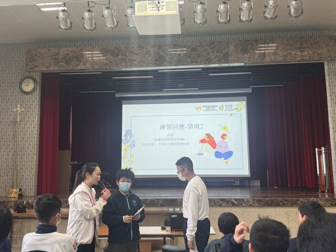 活動更增添了情境練習。導師放咗一些常見中學生情境,讓台上同學即興回應同討論。大家試咗唔同表達方式,導師即時指導點樣用平靜堅定嘅態度拒絕不當行為,並保護自己情緒。