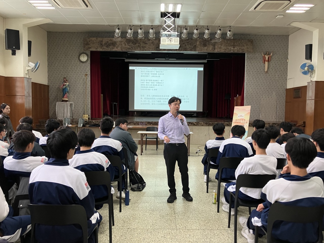為培養學生閱讀寫作風氣,澳門基金會於本年十一月二十一日下午二時十五分至三時四十分,假本校無原罪聖母禮堂為全體高二級同學舉辦了一場別開生面的閱讀寫作講座。是次活動屬第卅一屆澳門中學生讀後感徵文比賽系列活動之一,師生約一百三十人參與。