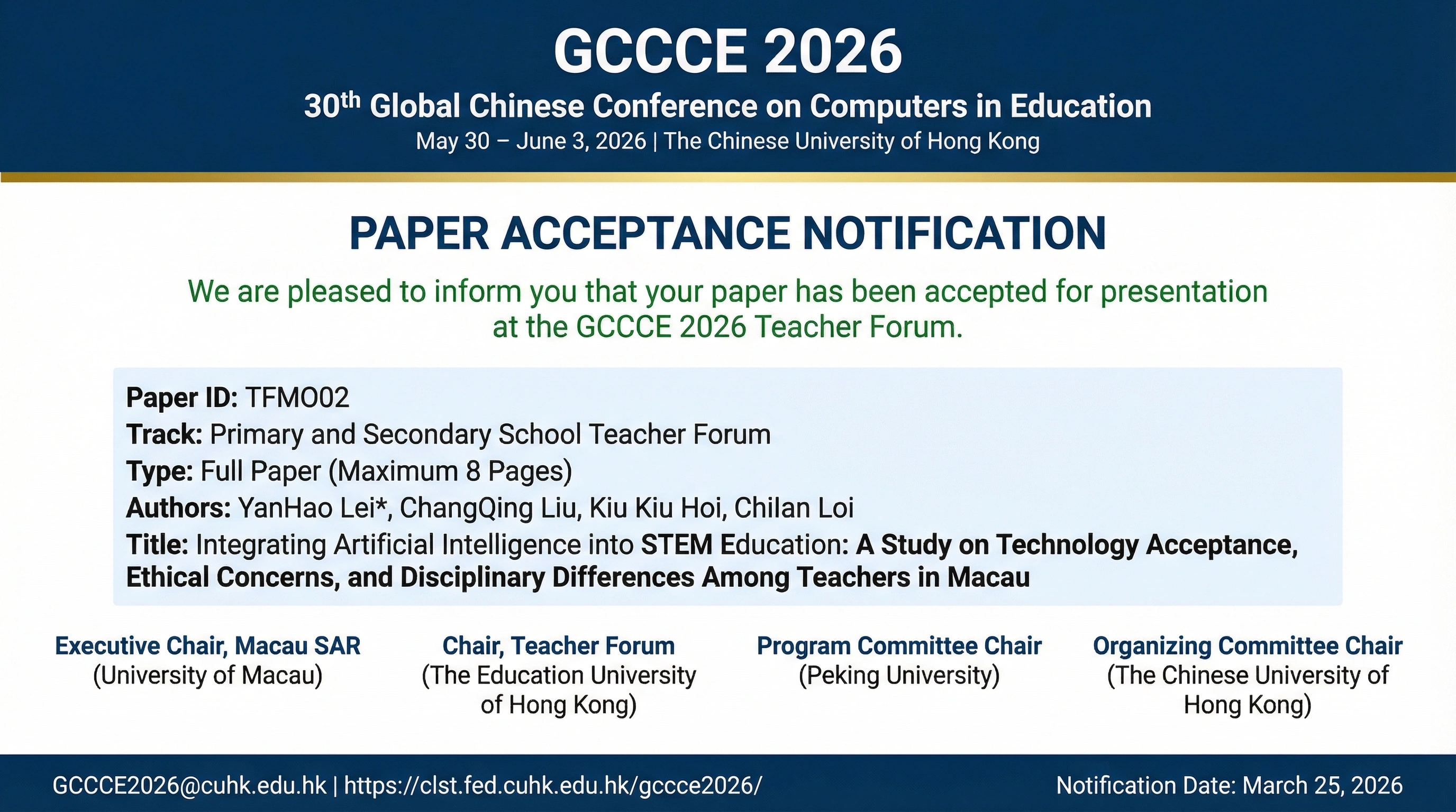 本校在推動教育科技創新與教師專業發展方面再創佳績!本校李燕豪老師的最新學術研究論文——《Integrating Artificial Intelligence into STEM Education: A Study on Technology Acceptance, Ethical Concerns, and Disciplinary Differences Among Teachers in Macau》(將人工智能融入STEM教育:澳門中學教師與學生的接受度、倫理關注及學科差異研究),近日正式獲得“第三十屆全球華人計算機教育應用大會”(Global Chinese Conference on Computers in Education, GCCCE 2026)接受收錄。更獲大會誠摯邀請,將於2026年5月底前往香港中文大學出席是次盛會,並發表其研究成果,與來自世界各地的學者專家進行深入交流。