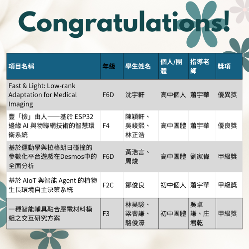 | Fast & Light: Low-rank Adaptation for Medical Imaging | F6D | 沈宇軒 | 高中個人 | 蕭宇華 | 優異獎 |