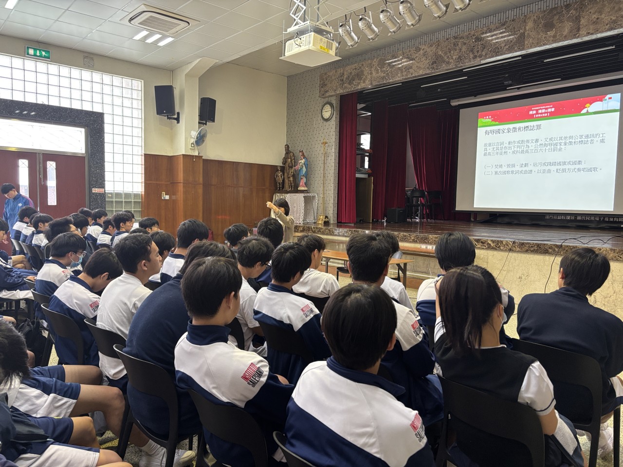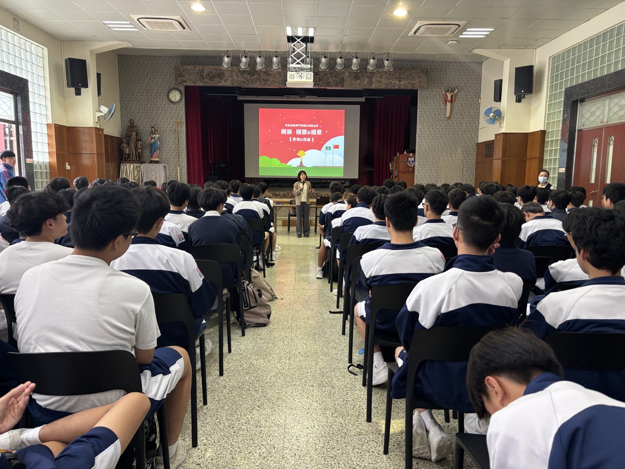 本校教導處邀請澳門法務局代表專員蒞臨本校,於中學禮堂為中五及中六共八班學生舉辦「齊來認識澳門特別行政區法律——國旗、國徽及國歌的使用及保護」講座,參與師生約250人。講座內容圍繞《國旗法》《國徽法》《國歌法》及相關行政法規,講解國旗、國徽及國歌的使用規範與應有禮儀,並提醒學生任何侮辱國家象徵的行為均須承擔法律責任。透過專業而清晰的講解,學生對國家象徵的法律保護有了更深入的認識,有助提升國家認同感與法治觀念。